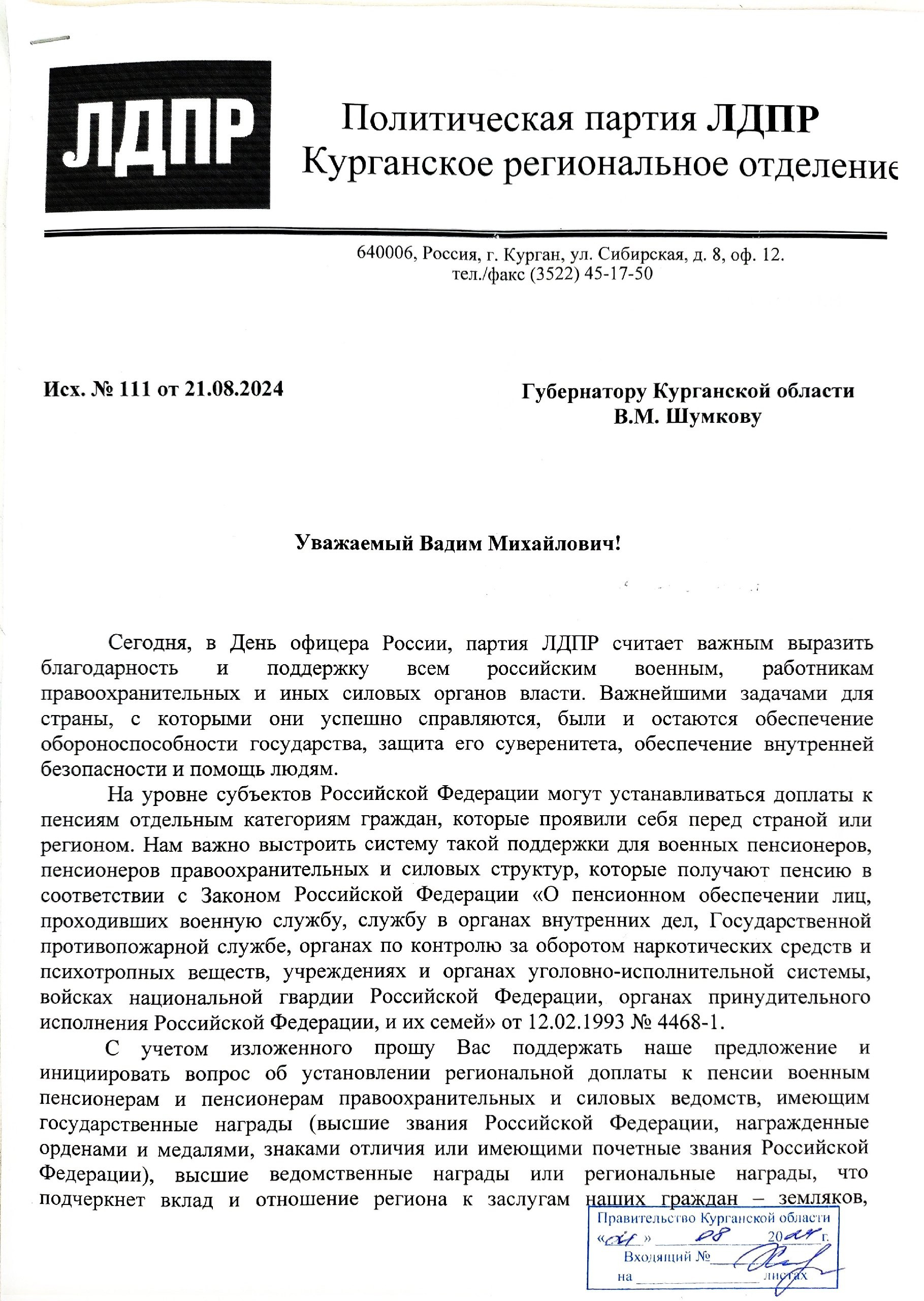 С учётом вышеизложенного, сегодня от Курганского регионального отделения ЛДПР было направлено обращение Губернатору Курганской области В.М. Шумкому о поддержки нашего предложения и инициирования вопроса об установлении региональной доплаты к пенсии военным пенсионерам и пенсионерам правоохранительных и силовых ведомств, имеющих государственные и высшие ведомственные награды, что подчёркивает вклад и отношение региона к заслугам наших граждан-земляков, проявивших себя перед страной, Курганской областью и гражданами при выполнении своего долга и являющихся примером для молодежи.