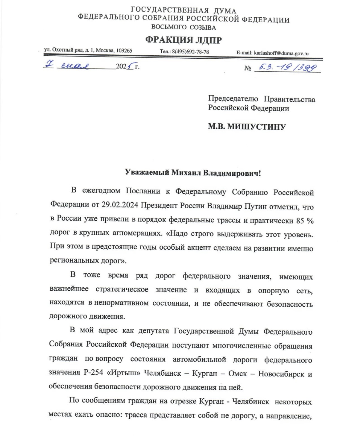 ЛДПР в Кургане: «Срочно спасти трассу Р-254 «Иртыш»: безопасность Курганской области под угрозой»