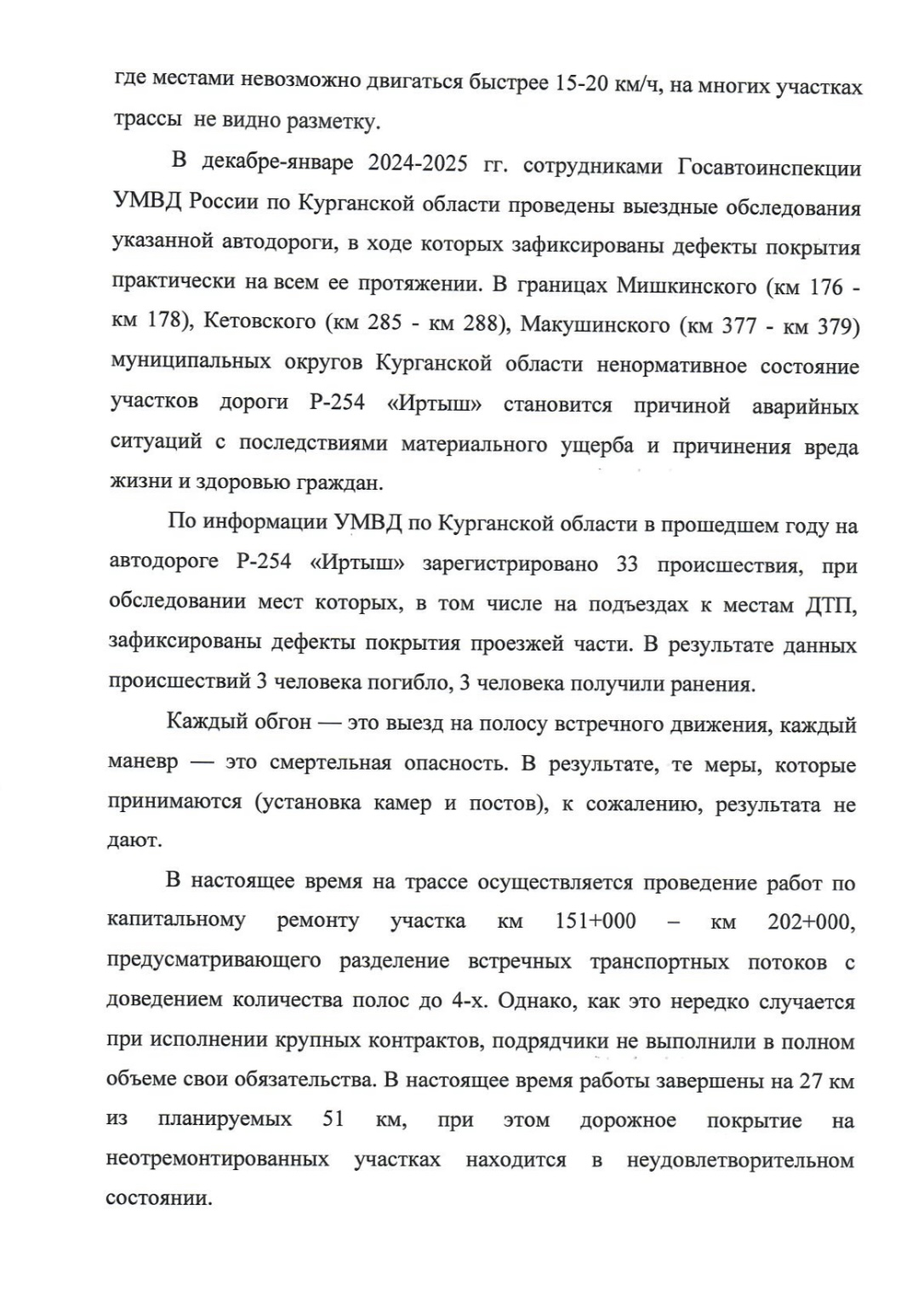 Трасса Р-254 «Иртыш», связывающая Курган с Челябинском, Новосибирском и Омском, превратилась в опасную зону. Несмотря на поручение президента Владимира Путина усилить внимание к региональным дорогам, ситуация здесь критическая: за год зафиксировано 33 ДТП, три человека погибли, трое получили ранения. Основные причины — разрушенное покрытие, отсутствие разметки и низкое качество ремонтных работ