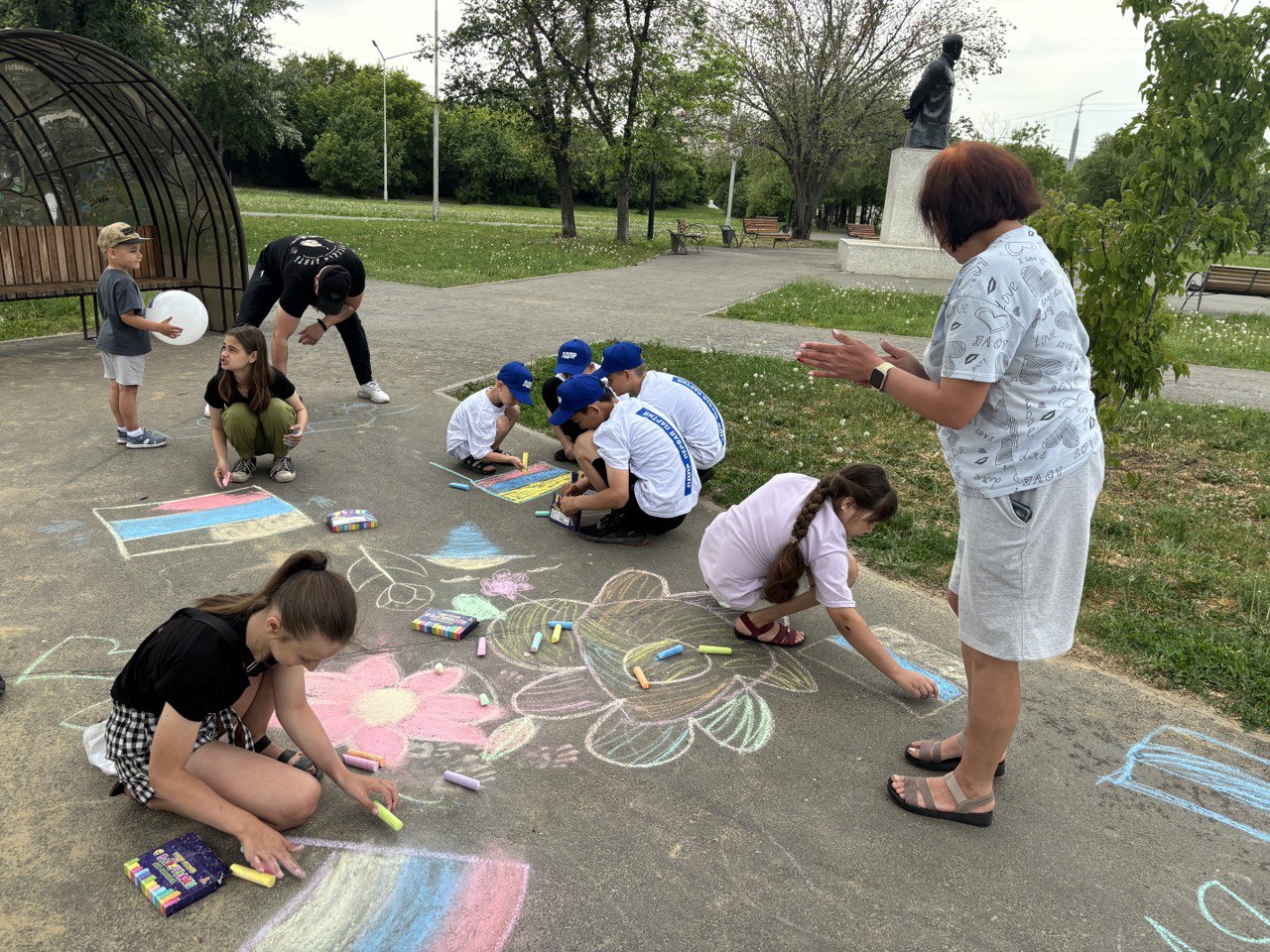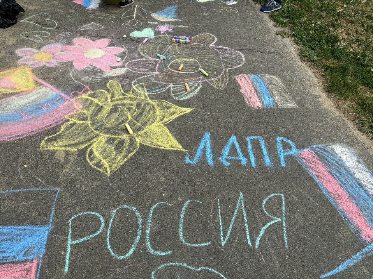 Дети с энтузиазмом участвовали в конкурсе рисунков на асфальте "Россия будущего", превращая серые тротуары в яркие картины. За участие юные художники получили полезные подарки: сладости, тетради и другие призы.