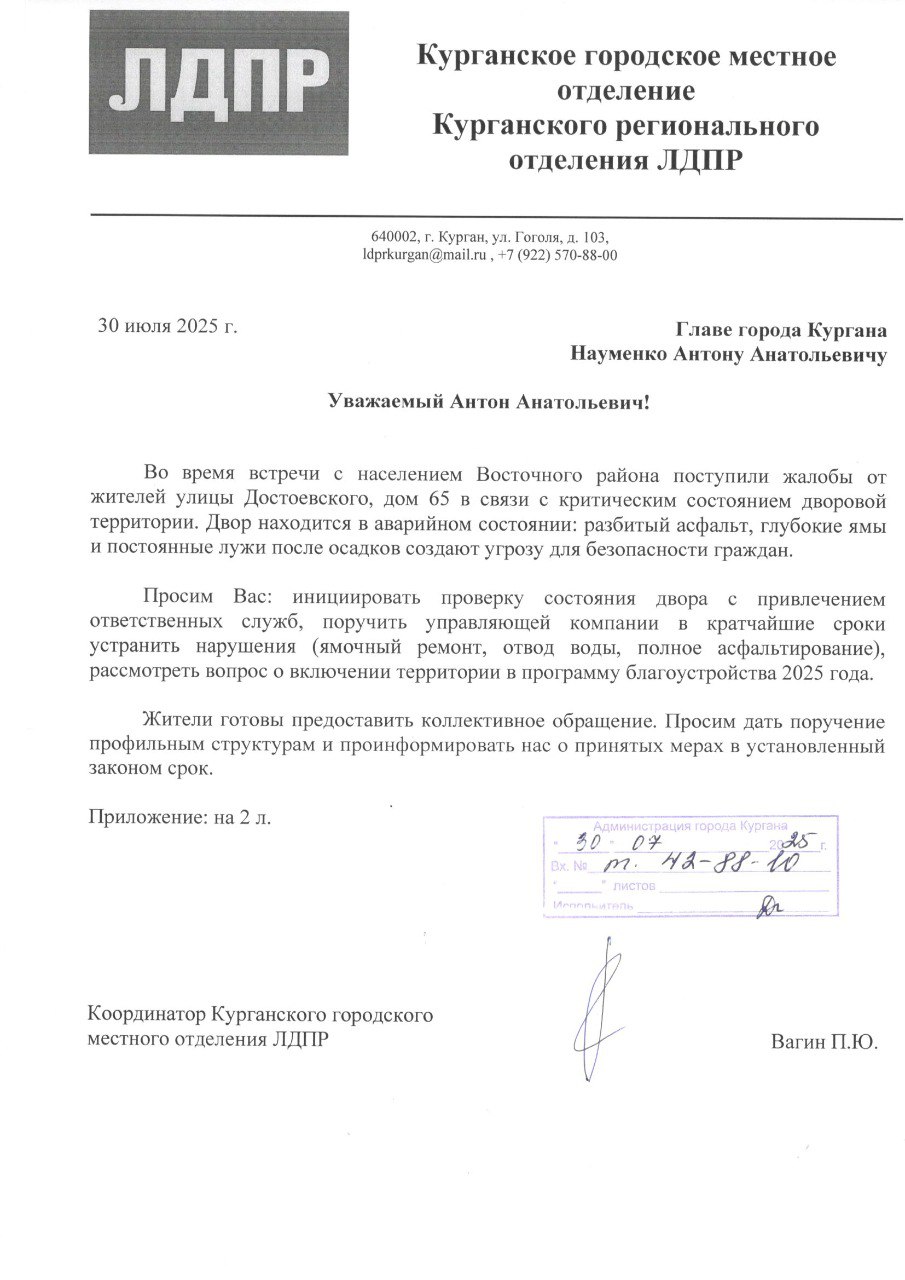 Координатор Курганского городского местного отделения ЛДПР Павел Вагин отреагировал на жалобы жителей дома по адресу Достоевского, 65 в микрорайоне Восточный. Граждане сообщают, что их двор находится в аварийном состоянии и напоминает "минное поле" из-за глубоких ям, разбитого асфальта и огромных луж после осадков