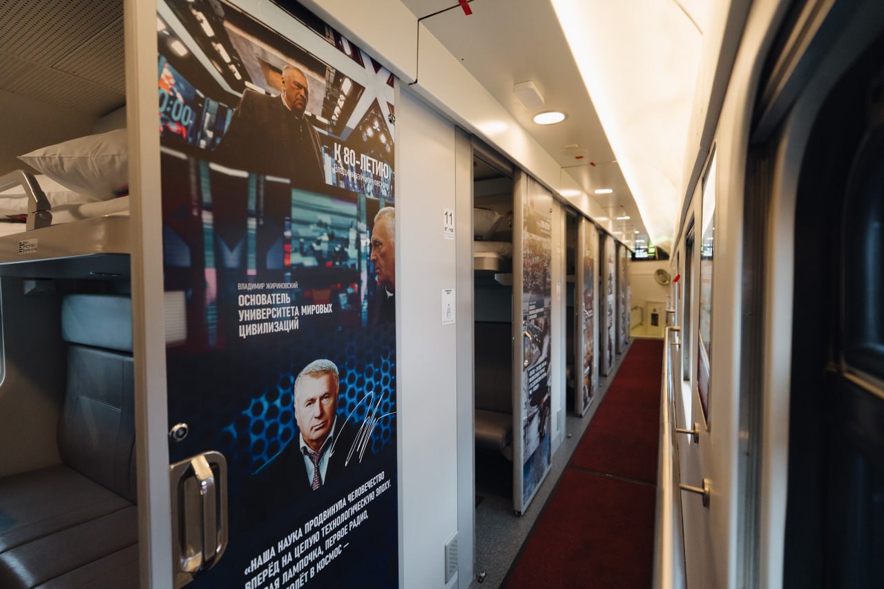 Вагоны украшает профиль Владимира Жириновского, его автограф и эмблема Фонда. Внутри пассажиры найдут мини-библиотеку с трудами политика и выставку его фотографий. В меню вагонов-ресторанов включили любимые блюда Жириновского.